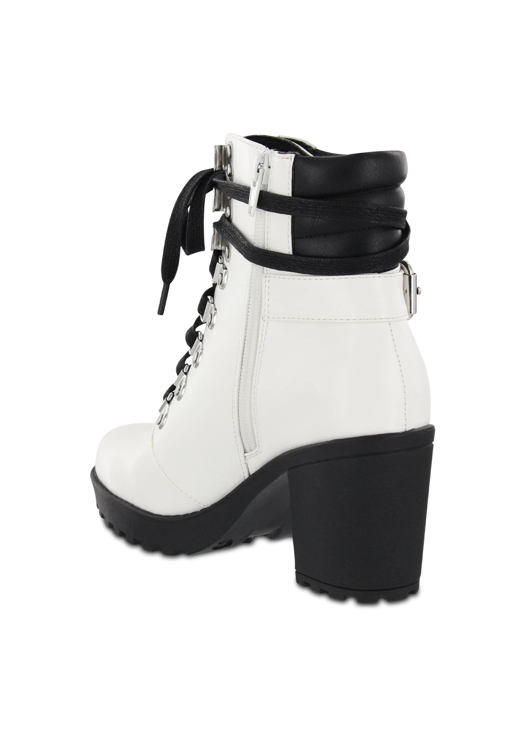 Opt for a re-boot this season with the ANNAMARIA combat boot. Designed from vegan leather, it features lace-ups at the front accented with metallic grommets and a hidden side zipper, in addition to an adjustable buckle and cushioning at the back ankle. Finished on a slip-resistant lug bottom sole and heel, they’re great for dressing up even the most casually cool outfits. #MIAsays wear the Annamaria boots with your favorite leggings and flannel for that off-duty look.
