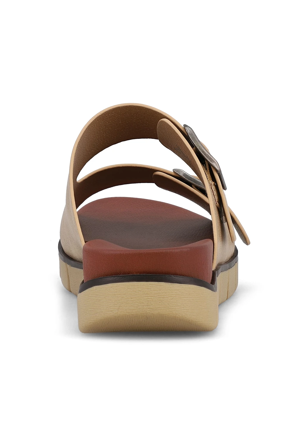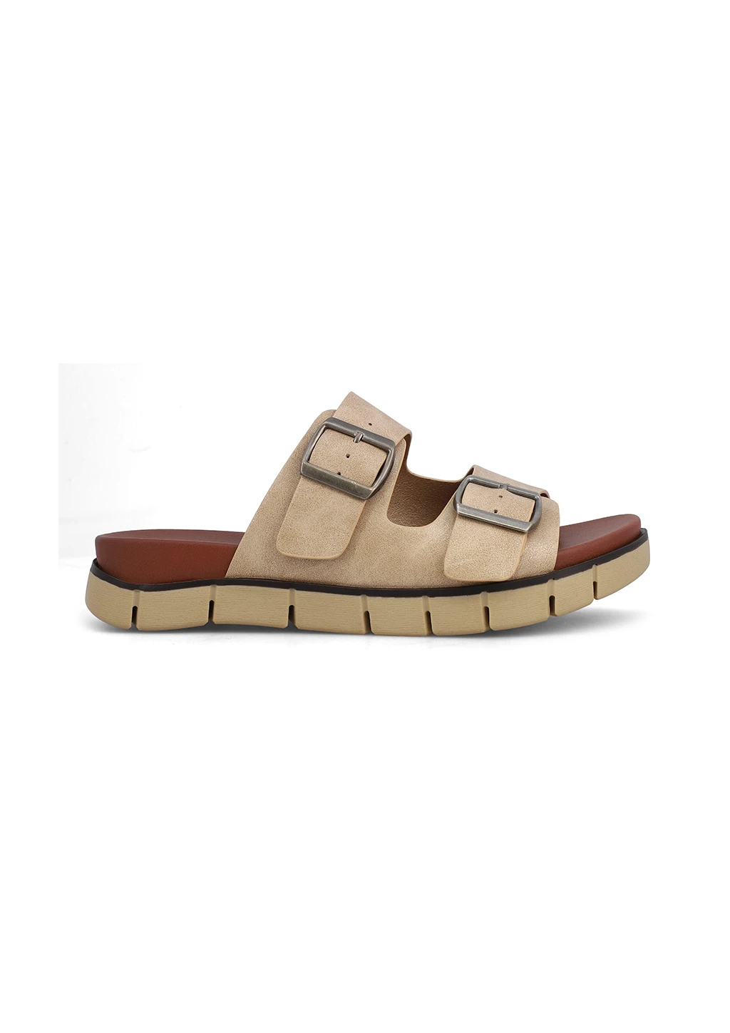 Our take on the trendy double buckle but with ultimate comfort. This everyday sandal features vegan suede and a sneaker bottom sole. Â Finished on our MIA signature footbed, because looking good should never mean sacrificing comfort.