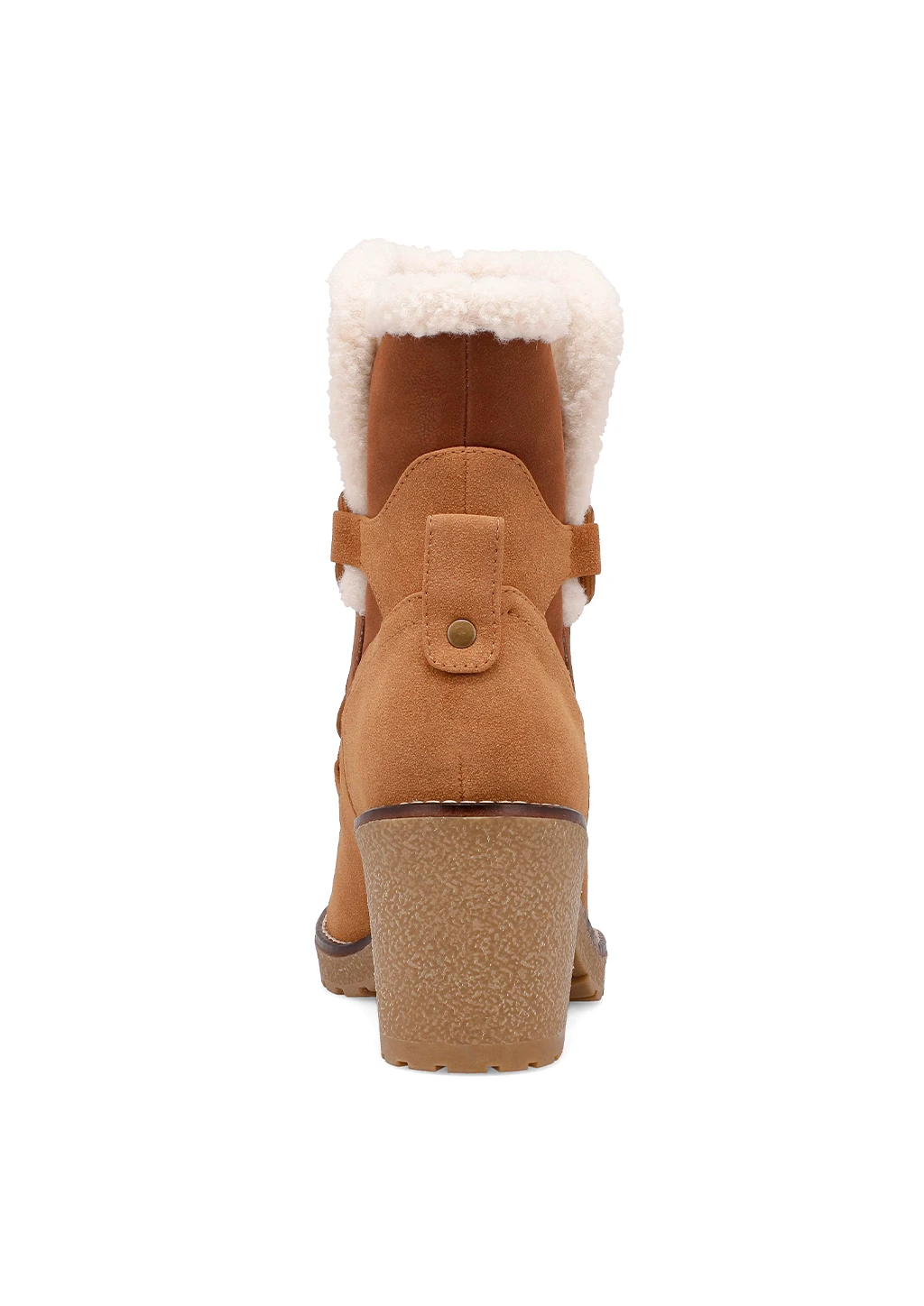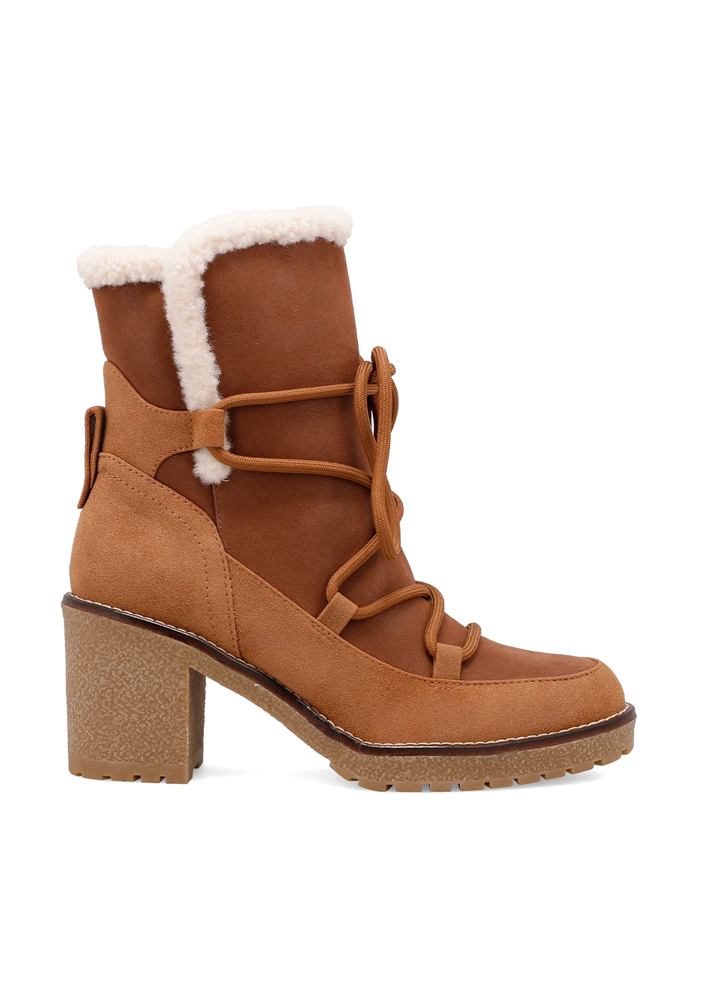 A cozy, yet chic boot everyone needs in their closet: HOLIDAY. A chunky boot that is crafted on a faux suede upper and sherpa fur lining for ultimate warmth and comfort. Featuring a 3-inch heel and thick lace ups. Dress up any outfit this winter in the HOLIDAY for an après ski look.