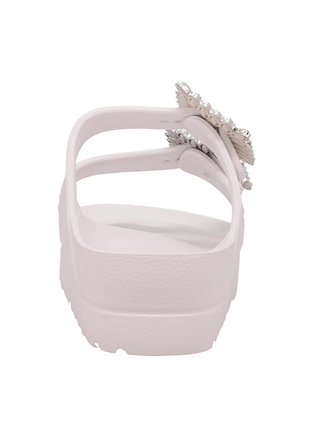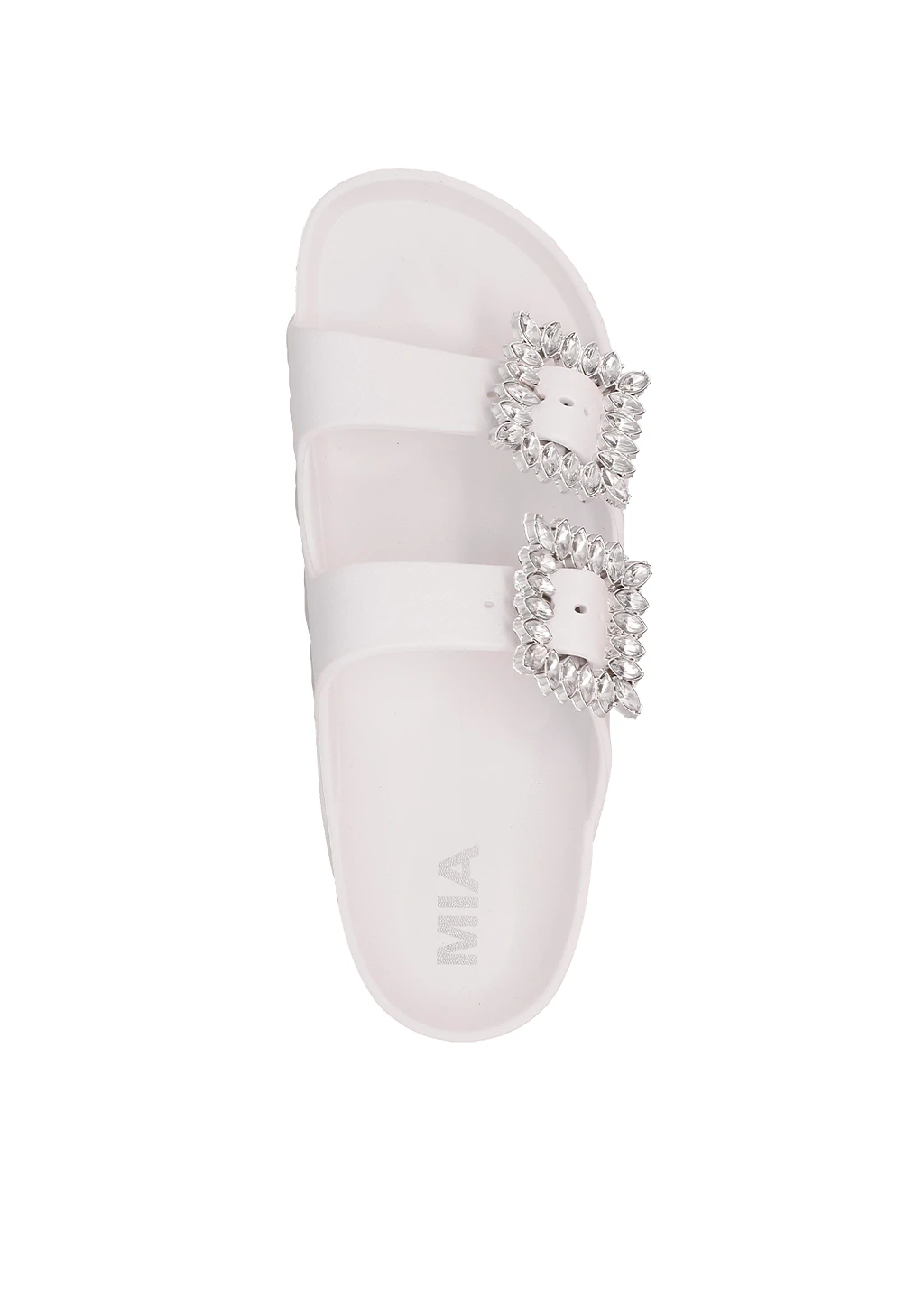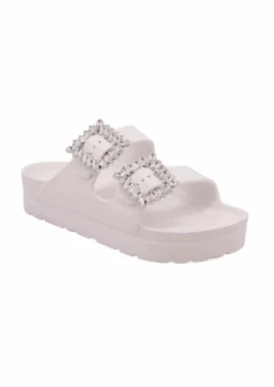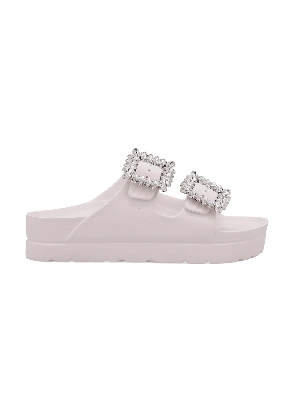 Your poolside staple just arrived. Say hello to KIANA-R, a classic rubber sandal featuring dual upper straps and a platform bottom. Finished with squared dual rhinestone buckle for added detail.